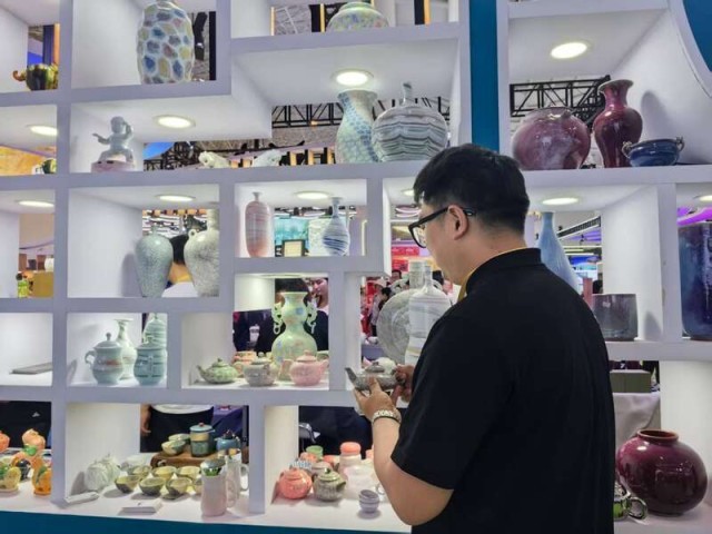 紧靠钧瓷的展厅上,花纹华丽的绞胎瓷引得许多消费者驻足观看。这项始于唐代、以“内外通透”为特色的技艺,经青年设计团队创新,将传统席编纹、羽毛纹融入茶器、首饰盒等设计。“现在的团队年轻人比较多,工厂里一半以上都是80、90后。”展台负责人、绞胎瓷县级非遗传承人柴欢向记者介绍,身为90后的他,大学学习的是体育新闻专业,但受到父亲的影响,他毕业后选择了传承绞胎瓷这门技艺,“这个工艺比较特殊,也非常好看”,绞胎瓷也吸引了很多当地大学生前往工厂体验非遗技艺,在这次消博会上,这些出自年轻团队的瓷器也收到了消费者的欢迎,“我们一上午就卖出了十套定制茶具套装”。