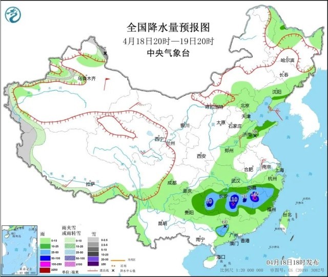 4月18日20时至19日20时,吉林东部山区、新疆北疆北部和南疆西部山区、西藏南部和西部等地部分地区有小到中雪或雨夹雪,局地有大雪。辽东半岛、黄淮东北部、江南大部、华南中北部以及贵州东部等地部分地区有中到大雨,其中,湖南西南部和中东部、江西西部和中东部、福建西北部、广东西北部等地部分地区有暴雨或大暴雨。