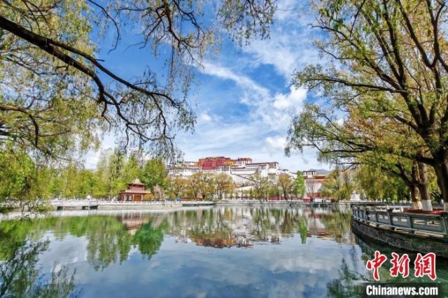 4月,高原古城拉萨一派春景,布达拉宫前后潭水凝碧、柳树摇青,游客络绎不绝。