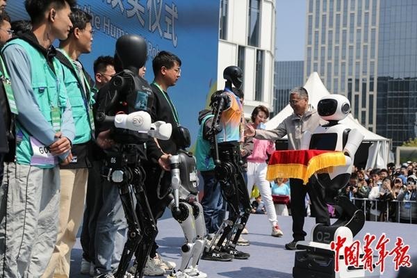 4月19日,北京亦庄半程马拉松暨人形机器人半程马拉松颁奖仪式,嘉宾为获得第一名的机器人颁奖。中青报·中青网记者 赵迪/摄