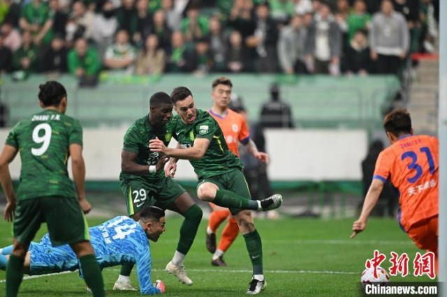 4月19日,在北京举行的2025赛季中国足球超级联赛第8轮比赛中,北京国安队主场以6比1战胜山东泰山队。图为北京国安队球员塞尔吉尼奥(右二)进球瞬间。 中新社记者 田雨昊 摄