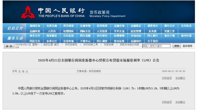 中新网4月21日电 据央行网站消息,中国人民银行授权全国银行间同业拆借中心公布,2025年4月21日贷款市场报价利率(LPR)为:1年期LPR为3.1%,5年期以上LPR为3.6%。以上LPR在下一次发布LPR之前有效。