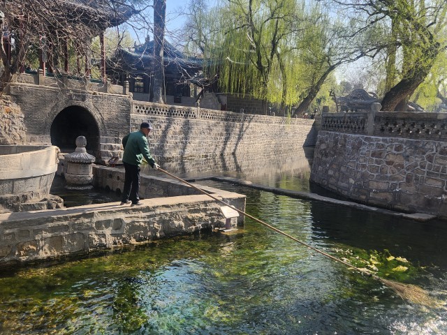 山西省太原市晋祠千年古泉——难老泉边,工作人员正在清理水面。中青报·中青网记者 魏婉/摄
