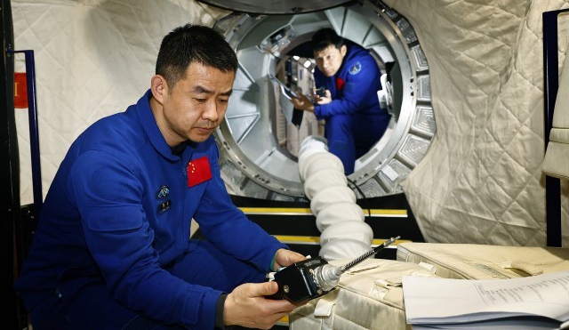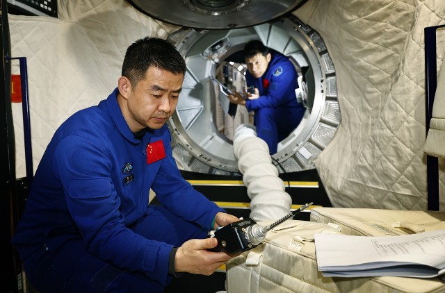 2025年2月25日,神舟二十号航天员陈冬(前)在货运飞船模拟舱训练。 徐部/摄