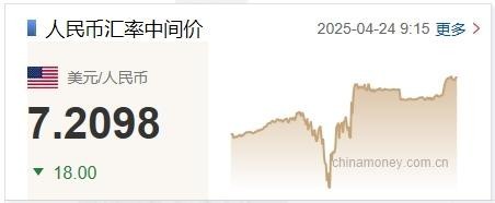 中新网4月24日电 据中国外汇交易中心网站消息,中国人民银行授权中国外汇交易中心公布,2025年4月24日银行间外汇市场人民币汇率中间价为:1美元对人民币7.2098元,上调18个基点。