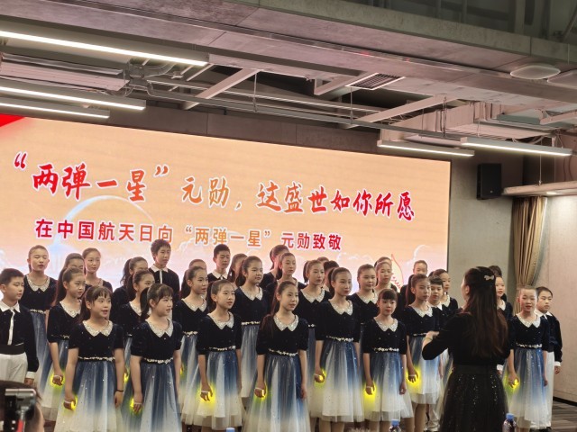 4月24日,“两弹一星”在海淀主题展馆内,北京市海淀区人大附中航天城学校学生合唱团演唱歌曲《如愿》。中青报·中青网记者 尹希宁/摄