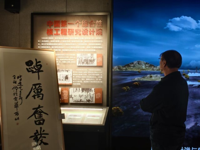 4月24日,“两弹一星”在海淀主题展馆内,一名观众在看展览。中青报·中青网记者 尹希宁/摄