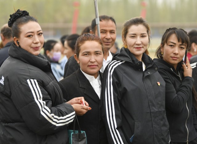 柔鲜古丽(右二)和奥依托格拉克乡的村民在一起。新华社记者胡虎虎摄