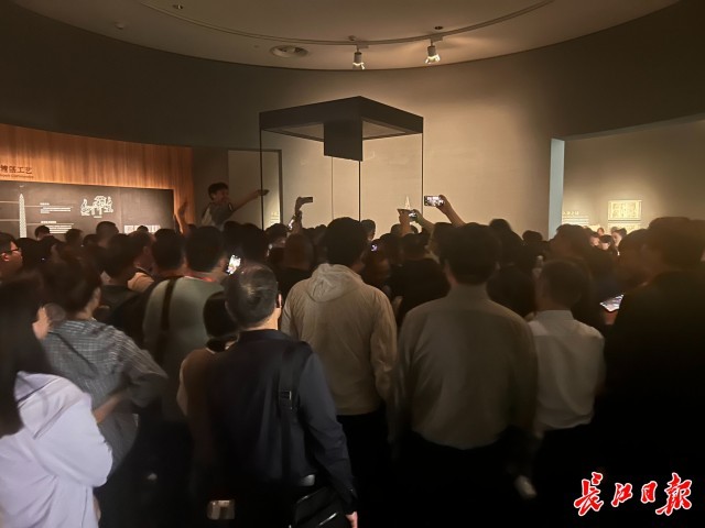 在湖北省博物馆的越王勾践剑展厅,这件镇馆之宝被上百人围住拍照已是常态。4月23日下午,记者随着展厅门口蜿蜒数十米的长队缓缓走入,又在人群外围等候了近10分钟,才抓住机会挤到第一排,一睹越王勾践剑真容。同一时刻,在陈列曾侯乙编钟、云梦睡虎地秦简等重量级藏品的展厅,也是人头攒动的相似景象。