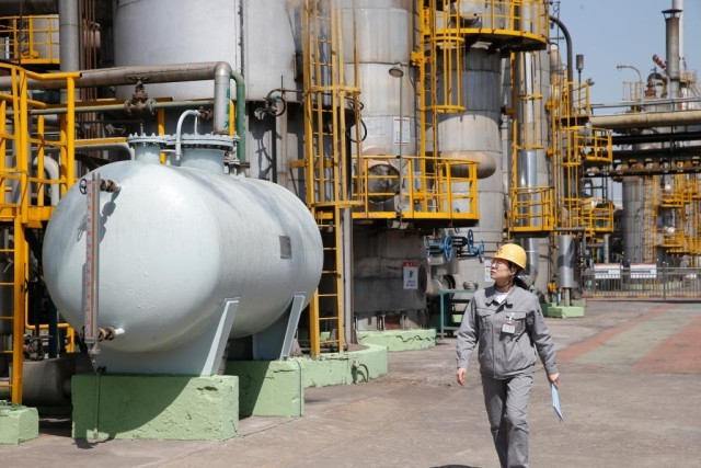 爬上十几米高的塔架,邓晶和同事开始进行巡检工作。从她所处的位置眺望,整个甲醇装置厂区尽收眼底——一个个巨大的反应炉,高耸的烟筒,还有各色复杂排列的管路。