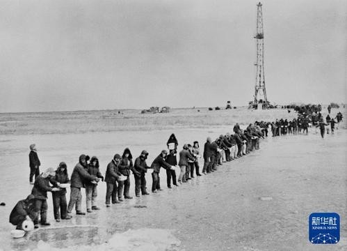 20世纪60年代初期,大庆油田工人在艰苦创业之初破冰取水。新华社发
