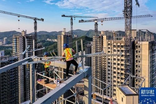 2022年10月20日,工人在广东深圳福田区华富村回迁安置房楼顶进行幕墙装配作业。 新华社记者 刘大伟 摄