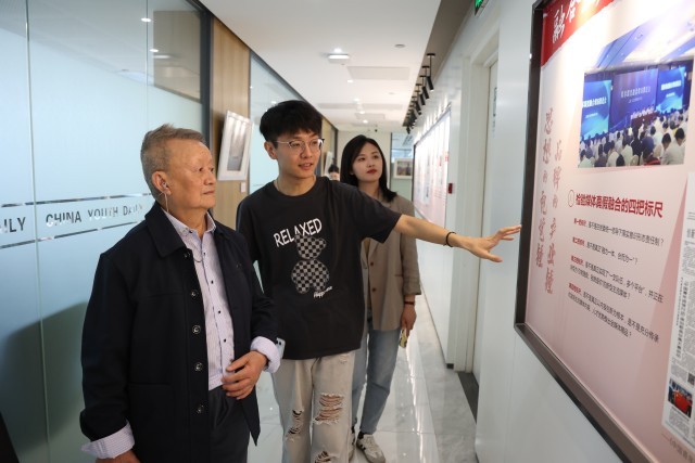 《中国青年报》青年编委会成员向张铸林(左)介绍中青报文化长廊。中青报·中青网记者 王鑫昕/摄