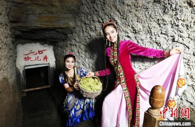身着传统服饰的当地群众在坎儿井打卡拍照。吐鲁番市融媒体中心供图