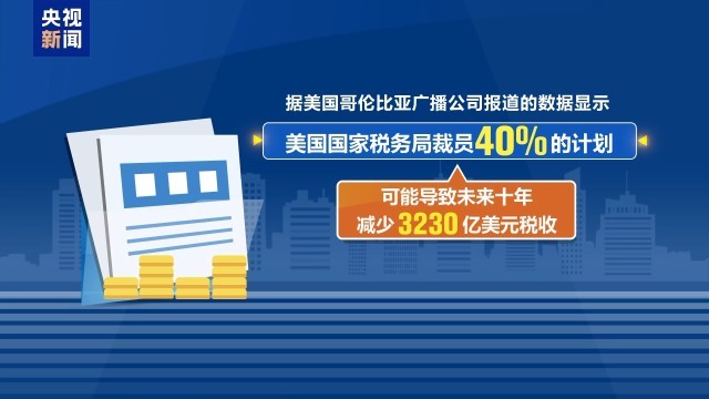 据美国哥伦比亚广播公司报道的数据显示,美国国家税务局裁员40%的计划,可能导致未来十年减少3230亿美元税收。