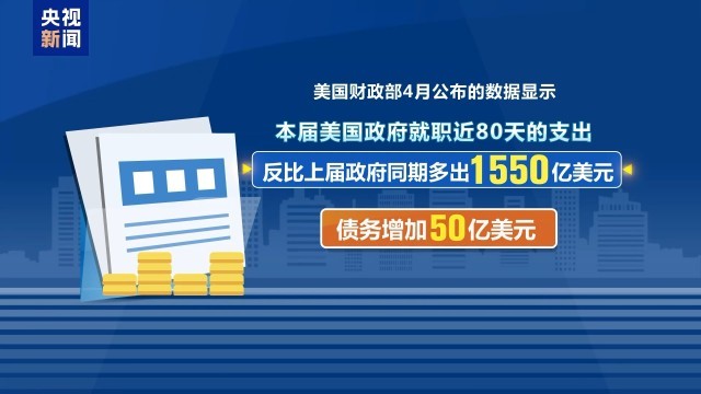 美国财政部4月公布的数据显示,本届美国政府就职近80天的支出反比上届政府同期多出1550亿美元,债务增加50亿美元。