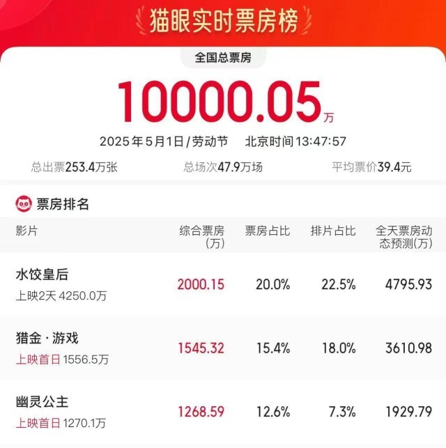 据网络平台数据,截至5月1日13时47分,2025年五一劳动节票房破亿,《水饺皇后》领跑劳动节票房榜。