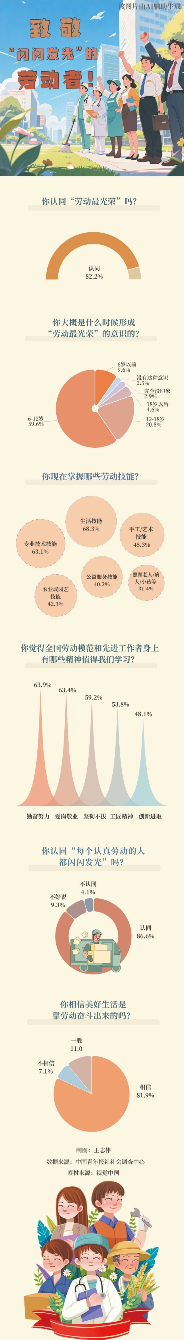 今天是“五一”国际劳动节。“劳动最光荣”这句小时候常听到的口号,成为很多人对劳动最朴素、最深刻的认知。你是什么时候形成“劳动最光荣”的意识的?在中国青年报社社会调查中心最新进行的“劳动精神”调查中,59.6%的受访者表示是在6-12岁,20.8%的受访者是在12-18岁。91.5%的受访者对自己能成为一个“自食其力的劳动者”感到光荣。