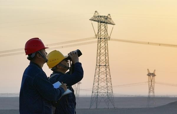5月1日,在新疆哈密市雅满苏镇附近的±1100千伏昌吉-古泉特高压直流输电线路旁,新疆送变电公司员工对线路开展巡视(无人机照片)。张利民/摄(新华社发)