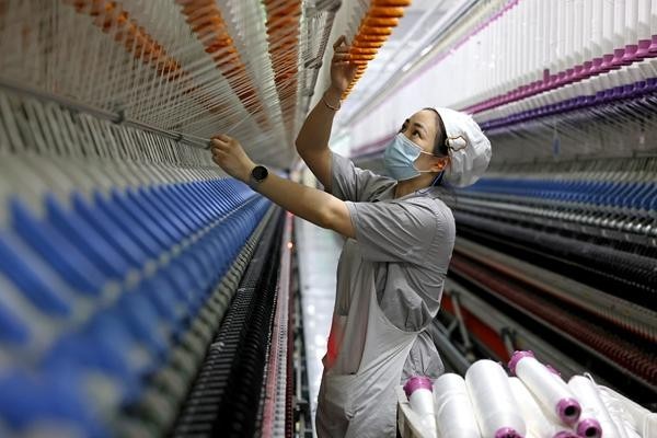5月1日,山东枣庄经济开发区一家企业工人在加工纱线。孙中喆/摄(新华社发)
