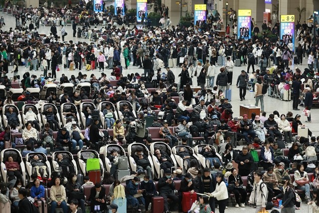 2025年5月1日,黑龙江省哈尔滨市,“五一”假期到来,哈尔滨站内,旅客熙熙攘攘,大家有序乘车。图片来源:视觉中国