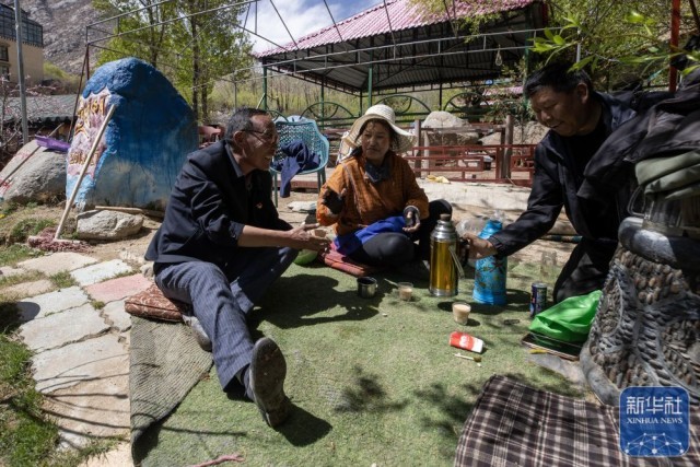 尼玛(左)在村里与一家农家乐的经营者交谈(4月24日摄)。