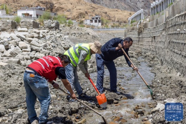 尼玛(右)与村民一起疏通村中水道(4月24日摄)。