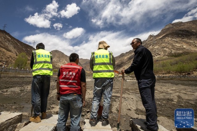 尼玛(右一)与防汛工作人员一起巡查村中水道(4月24日摄)。