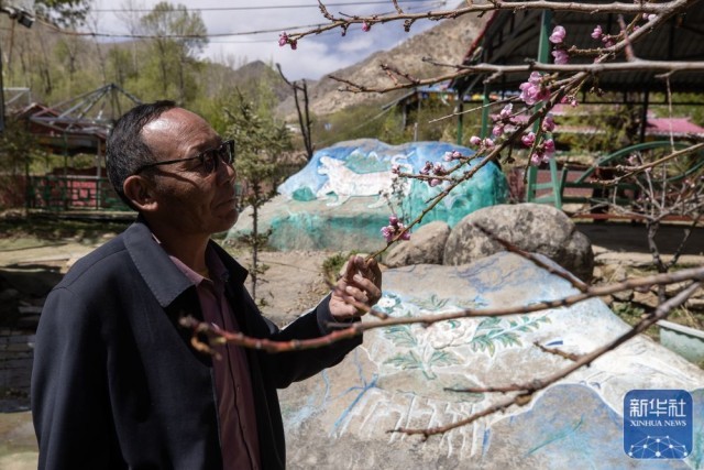 尼玛在村里一家农家乐的桃花树前驻足停留(4月24日摄)。
