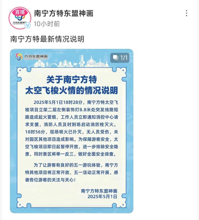 据“南宁方特东盟神画”通报,5月1日,广西南宁方特东盟神画景区“太空飞梭”项目因装饰灯线路短路引发火情。现场明火于当日18时56分扑灭,未造成人员伤亡及其他设施影响。景区表示,事发后立即启动消防预案,该项目即日起停运检修,同时全面排查园区安全隐患。五一期间其余项目正常开放,游客可继续体验其他活动。
