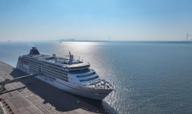 “欧罗巴2”号邮轮靠泊天津国际邮轮母港(无人机照片)。新华社记者孙凡越摄