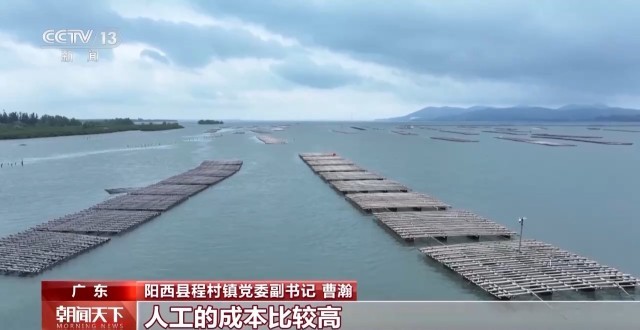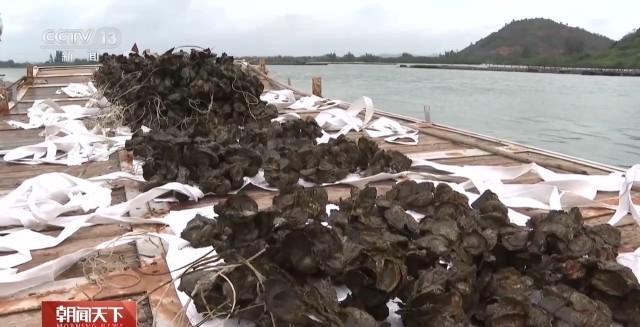 阳西县程村镇党委副书记 曹瀚:以前的立柱式养殖必须要有水泥桩,还要打桩进去,人工的成本比较高。延绳吊养生蚝的时候,我们能够及时根据海水咸湿度情况进行转移,有利于蚝尽快长大。