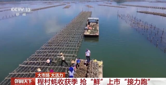 总台央视记者 李啸虎:在国家农业产业强镇广东阳西程村镇,“五一”期间,这里的生蚝迎来大量上市。这片占地六万多亩的生蚝养殖基地里,养殖户正从水下收获一排排成熟的生蚝,40多万箱新捕捞的海鲜正从这里走上百姓的节日餐桌。