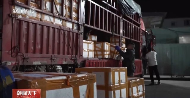 排队的冷链物流车来到卸货地点后,市场商户以最快速度卸货,转运上车,拉回店铺。