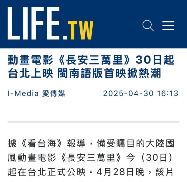 就在“五一”假期前夕,大陆动画电影《长安三万里》的全新制作闽南版本在台湾地区热映,受到大量喜爱中华优秀传统文化的台湾青年热烈追捧。