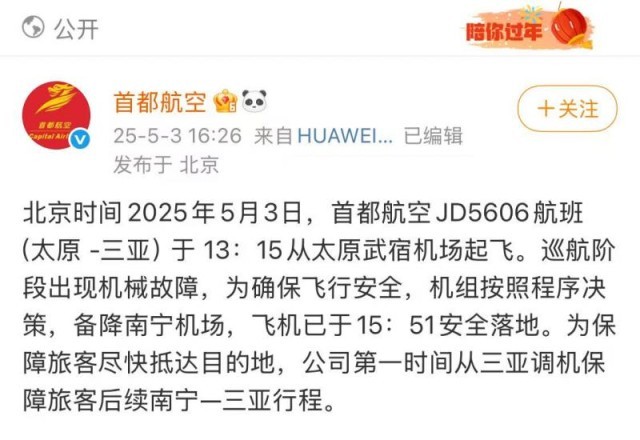 3日,首都航空官方微博发布公告,JD5606航班(太原 -三亚) 于13:15从太原武宿机场起飞。起飞后,出现机械故障,为确保飞行安全,机组按照程序决策,备降南宁机场,飞机已于15:51安全落地。为保障旅客尽快抵达目的地,公司第一时间从三亚调机保障旅客后续南宁—三亚行程。
