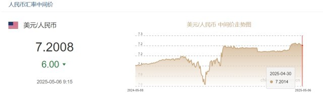 中新网5月6日电 据中国外汇交易中心网站消息,中国人民银行授权中国外汇交易中心公布,2025年5月6日银行间外汇市场人民币汇率中间价为:1美元对人民币7.2008元,上调6个基点。