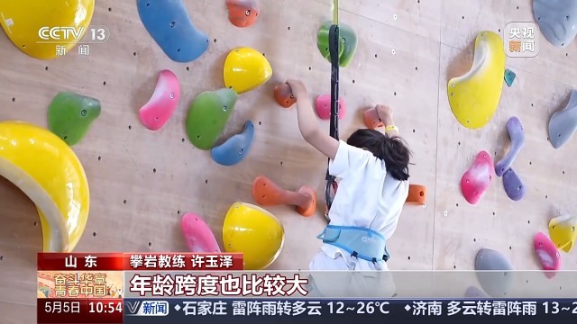 攀岩教练 许玉泽:假期的客流量上升比较明显,年龄跨度挺大,愿意来尝试这项运动的人越来越多。