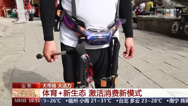 与此同时,体育正在和文旅深度融合,打开更大市场。这个“五一”假期,爬山变得更省力了。在泰山,不少游客都穿上了“登山助力机器人”,不到2公斤重,可以在登山时提供向上的助力,节省30%到50%的体力。