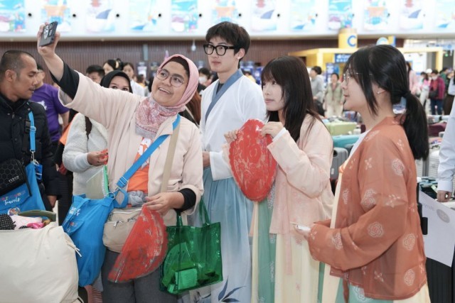 5月1日,游客在天津国际邮轮母港客运大厅与演出人员合影。