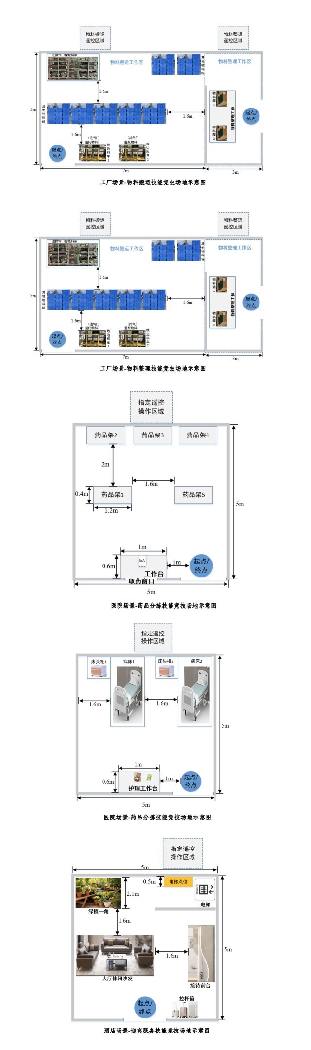场景赛聚焦人形机器人实际应用场景,设置了工业场景、医院场景和酒店场景,共6个项目。其中工业场景包括工厂物料搬运与整理,医院场景包括药品分拣与分装,酒店场景包括迎宾与清洁服务。通过这些应用场景,展示机器人的实用技能和智能化水平。