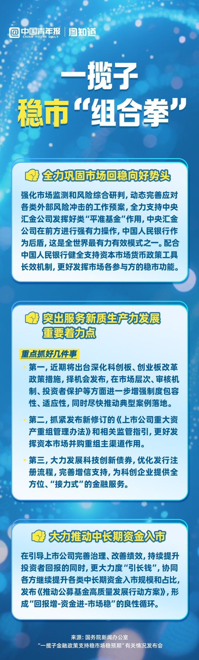 今天,国务院新闻办公室召开的“一揽子金融政策支持稳市场稳预期”有关情况发布会发布了多条政策措施。证监会打出一揽子稳市“组合拳”。读图速览。
