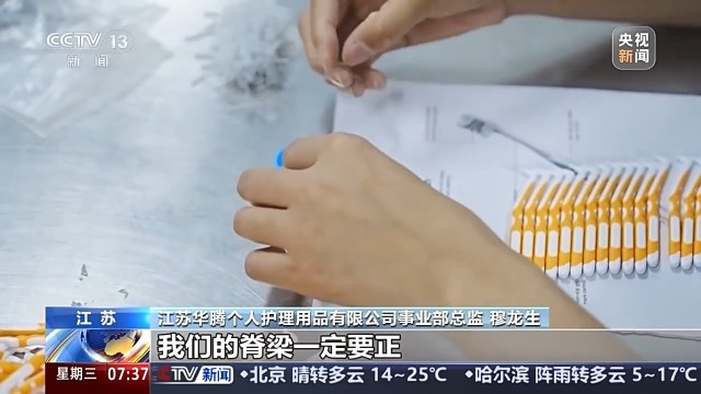 江苏华腾个人护理用品有限公司事业部总监 穆龙生:在牙线上面加入一些特定的配方,让用户在洁牙的同时也得到了护齿。我们现在也是自研了一些特殊的刷丝,这些刷丝也能完美取代一些国外进口品牌。
