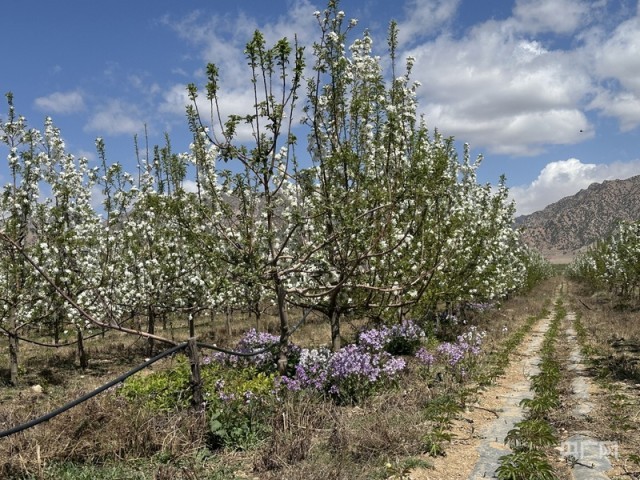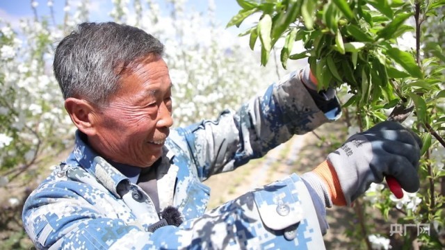 央广网巴彦淖尔5月7日消息(记者魏全民)步入内蒙古巴彦淖尔市乌拉特前旗白彦花镇塔汉其嘎查林果产业园,大片果树迎来最美花期,微风拂过,花香沁人心脾,果园里村民高忠标正专注地修剪着果树。“我今年60多岁了,在这里打工五六年了,一个月能挣五六千块钱,挺好的。”