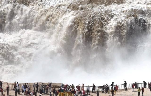 2025年4月9日,游客在山西吉县黄河壶口瀑布景区欣赏壮美的“桃花汛”。