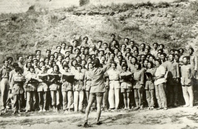 这是1939年冼星海指挥鲁艺学员排练《黄河大合唱》的资料照片。
