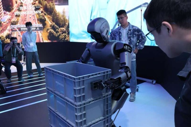 5月8日,第二十七届北京国际科技产业博览会展区内,正在搬运箱子的Walker S1机器人。杨丽/摄