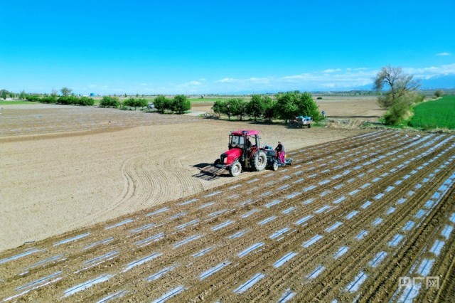 在吉木萨尔县三台镇羊圈台子村的高粱地里,装有北斗导航的大型播种机在田间来回穿梭作业,高粱种子被精准地播撒进土壤里,铺设地膜、滴灌带、播种、覆土、平整等工序一气呵成,与传统人工播种相比,机械化播种不仅速度快,还能保证播种深度和间距均匀一致,为高粱出苗整齐、生长健壮提供良好条件。