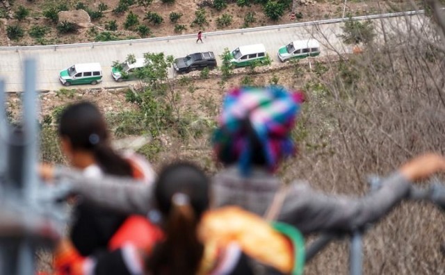 四川省昭觉县阿土列尔村(悬崖村旧称)村民沿着悬崖钢梯下山,准备搬家前往新家园,远处山脚下已停放好等待运送他们的车辆(2020年5月13日摄)。新华社记者 王曦 摄