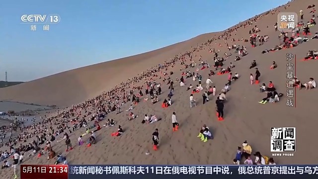 敦煌市鸣沙山月牙泉景区服务中心主任 黄文明:我们立刻就发布了闭园公告。同时也发布了万人演唱会暂停取消这个公告。我不停地反复广播。景区有大风天气现在已经闭园,请游客尽快到安全的地域,或者是尽快撤离景区,我们有应急预案,当时我们就启动了应急预案。本来就是各个点上我们都有人,五一旺季我们各个节点都有人值守,我们在这个群里面一发布,所有的工作人员都参与到疏导,包括我们的观光车都免费把游客往出口输送。慢慢大多数游客就往外走了,但有个别游客可能搞直播,没有感受到,没有体验过沙尘暴,还想往这个山上走,我们的工作人员就到山顶,爬到山顶把他们劝导下来。我看到的情形这就是风越来越大,能见度慢慢地降低。